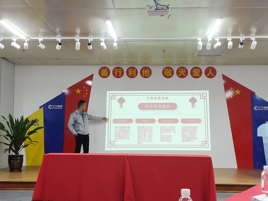 會議第一項議程,企業(yè)文化宣讀。全體人員整肅衣冠,對倍加推崇的三道文化“孝道、商道、人道”鄭重鞠躬,莊嚴(yán)宣誓企業(yè)愿景:“成為行業(yè)優(yōu)秀的智能自動化產(chǎn)業(yè)鏈集成服務(wù)商”,企業(yè)使命:做受尊敬的好人,造受尊敬的產(chǎn)品,辦受尊敬的企業(yè),建受尊敬的平臺,企業(yè)精神“用情做人、用心做事”,團(tuán)隊精神“忠誠團(tuán)結(jié)、勤奮進(jìn)取”,工匠精神:創(chuàng)于手、精于工、智于器、匠于心、品于行等。 會議第二項議程,胡總結(jié)理作2020年度銷售總結(jié)暨2021年工作計劃。通過四個章程(一、年度工作概述、二、年度完成情況、三、業(yè)態(tài)及成果、四、工作不足,五、2021工作計劃及策略),依次對2020年度銷售情況進(jìn)行深度分析。 第一章,工作概述。胡總通過以下四點(diǎn)來詮釋年度工作整體情況,1.公司實(shí)力板塊上升、目標(biāo)達(dá)成率高;2.匯利興自落地西南片區(qū)十年歷程以來,行業(yè)口碑逐漸上升;3.通過以“個人積極性、鍛造創(chuàng)新能力、延伸產(chǎn)業(yè)鏈”等行為上對團(tuán)隊進(jìn)行了深度的剖析,指出在面對新環(huán)境的挑戰(zhàn)下,團(tuán)隊要以創(chuàng)機(jī)遇抓機(jī)會的思想決策持續(xù)開展各項工作;4.自覺、自律、自勵——銷售部全員不斷在學(xué)習(xí)成長,用所學(xué)習(xí)的專業(yè)知識助力公司奔跑前行。自覺完成每次公司的委托,自律完成每一次托付,自勵督促自己蛻變成長!