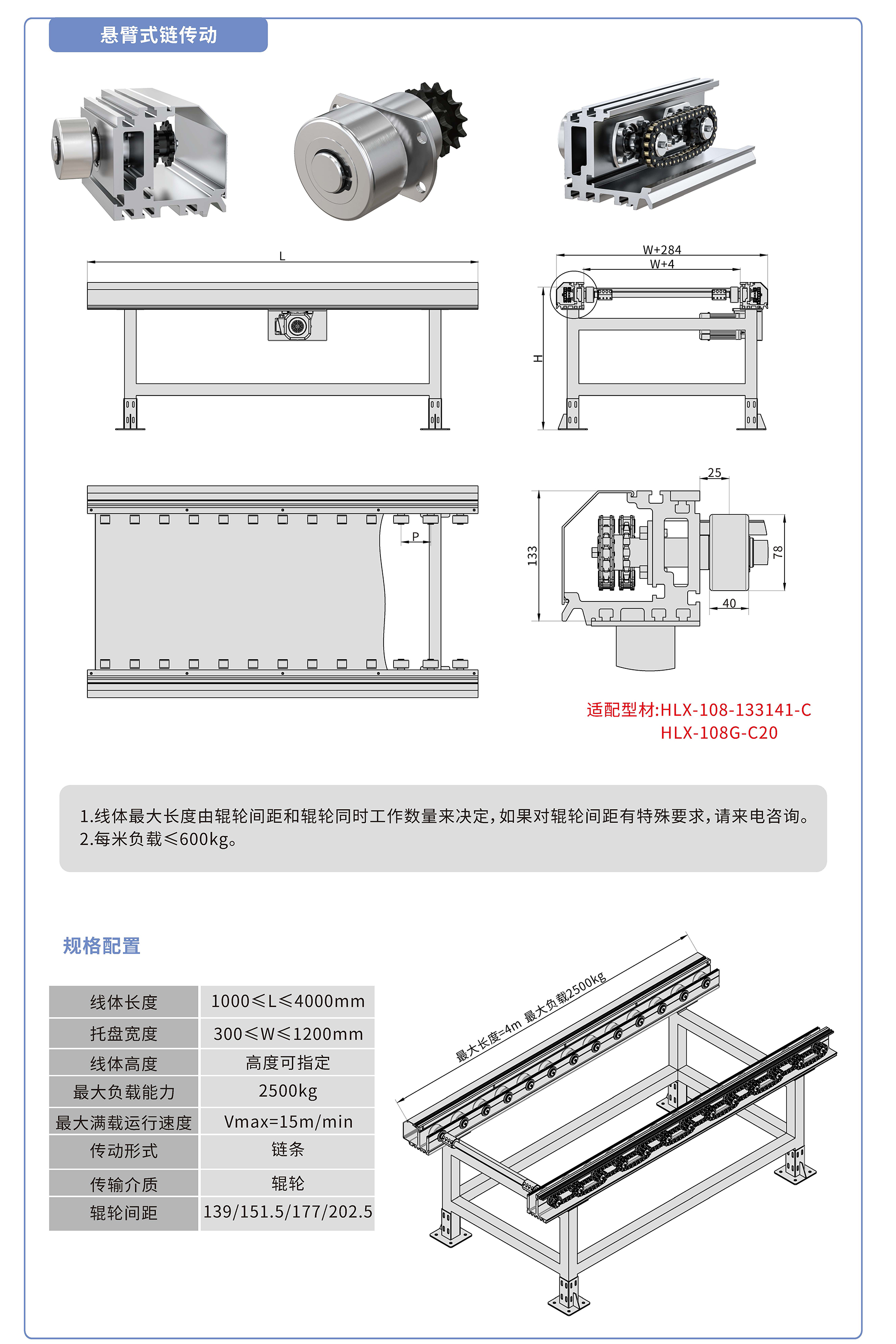 采用133141鋁型材,鏈輪傳動(dòng),鍍鉻滾輪鑲嵌銅套實(shí)現(xiàn)積放功能,負(fù)載2500kg/米,最大負(fù)載速度15M/min, 輪距139、151.5、177、202.5可選,適用托盤寬度300-1200mm,線體長(zhǎng)度范圍1000-4000mm, 高度根據(jù)需求定制.
